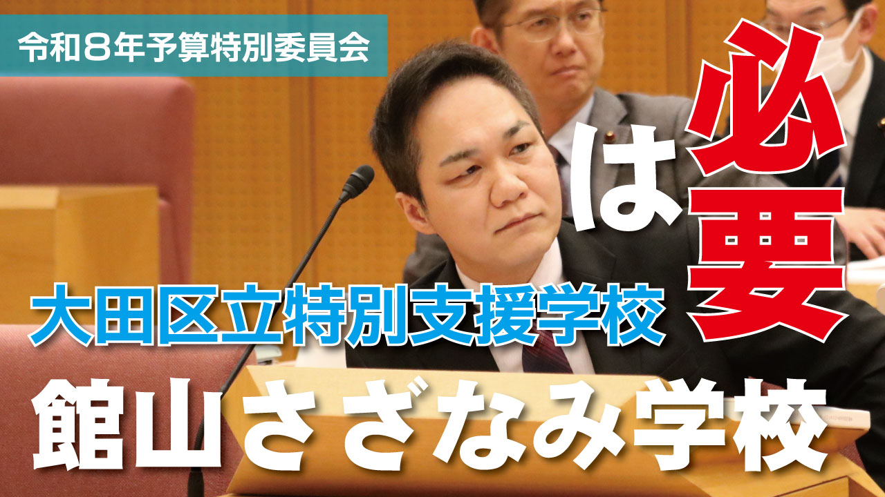 投稿日: 2026年3月23日 投稿者: admin大田区立館山さざなみ学校存続のために 大田区立館山さざなみ学校存続のために戦った予算委員会。 動画をアップしました。 今の大田区にとって必要な学校。 是非、多くの方に知ってほしい。 https://youtu.be/j9X1ekWZDKQ?si=oUXHHsDDcInvpB6K